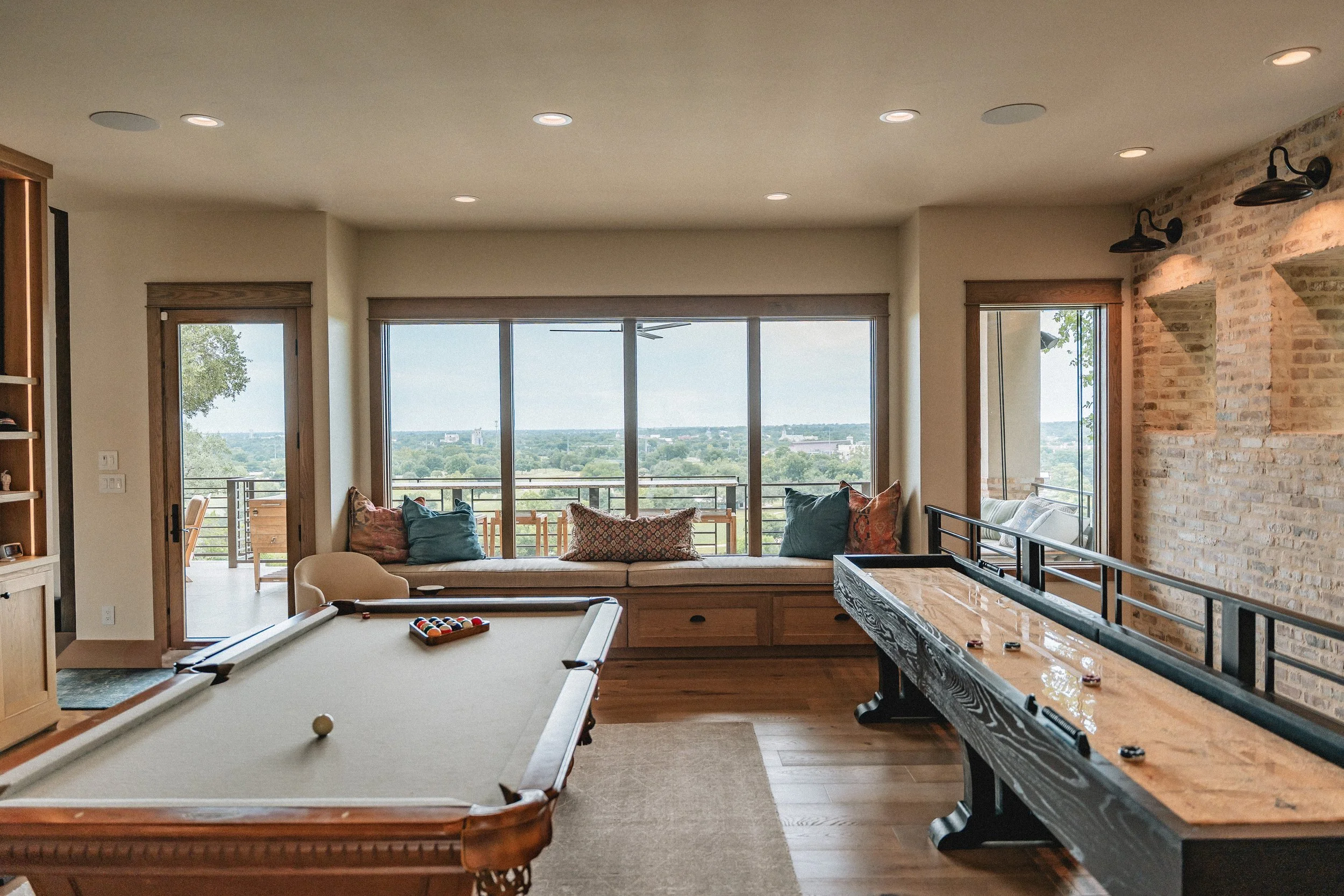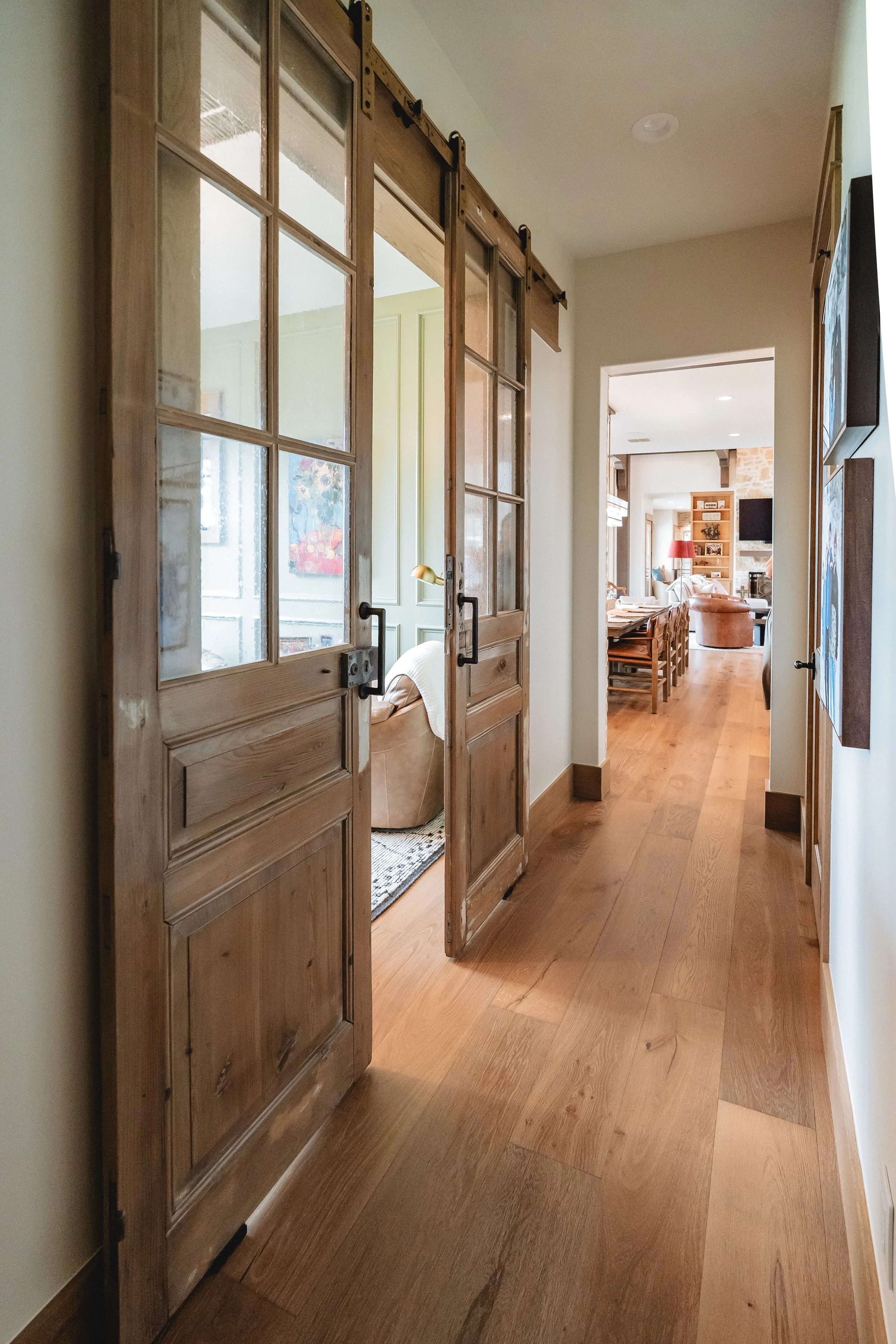 Exposed hanging beams, custom barn doors, hidden door features, and a double-sided fireplace establish character and create moments of discovery throughout the home.